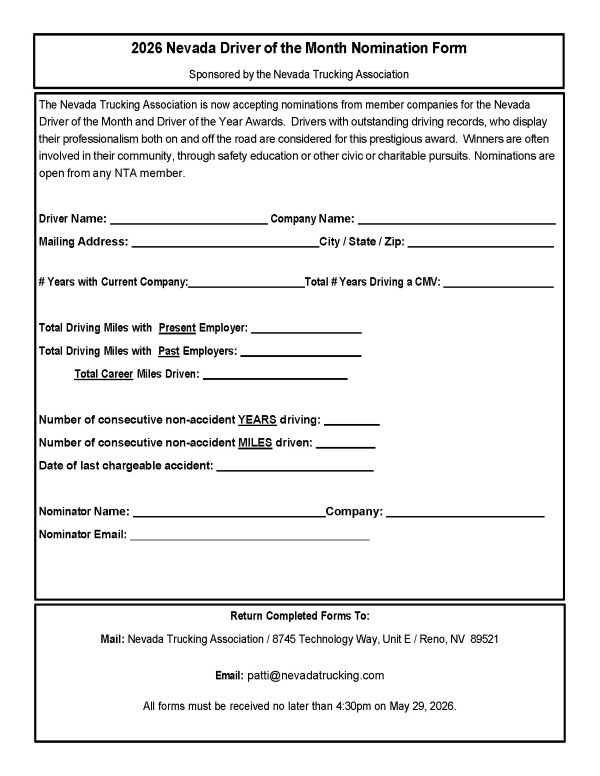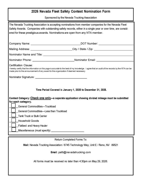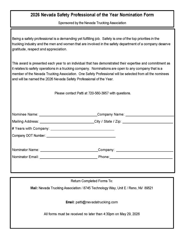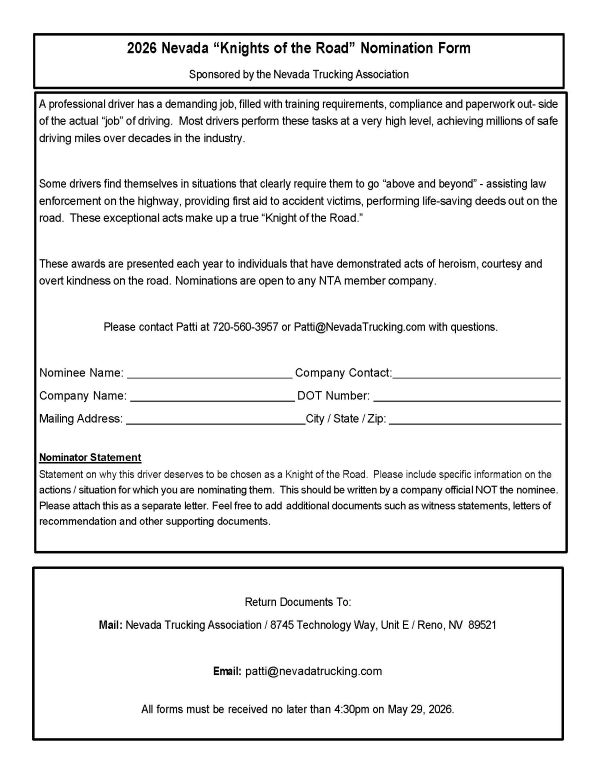 Check back after January 1st for the 2026 Awards Program. We will be accepting nominations for Driver of the Month, Safety Professional of the Year, Fleet Safety and Knights of the Road.